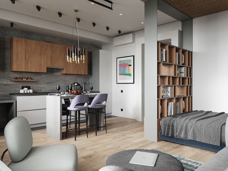 Stüdyo dairenizde alanınızı bölmek için kitaplıklar, dolaplar veya katlanabilir mobilyalarla bölün. Gerekmedikçe duvarlarla alanınızda yer israf etmeyin. Açık planlara geçin ve mobilyalarınızı bu iş için kullanın.