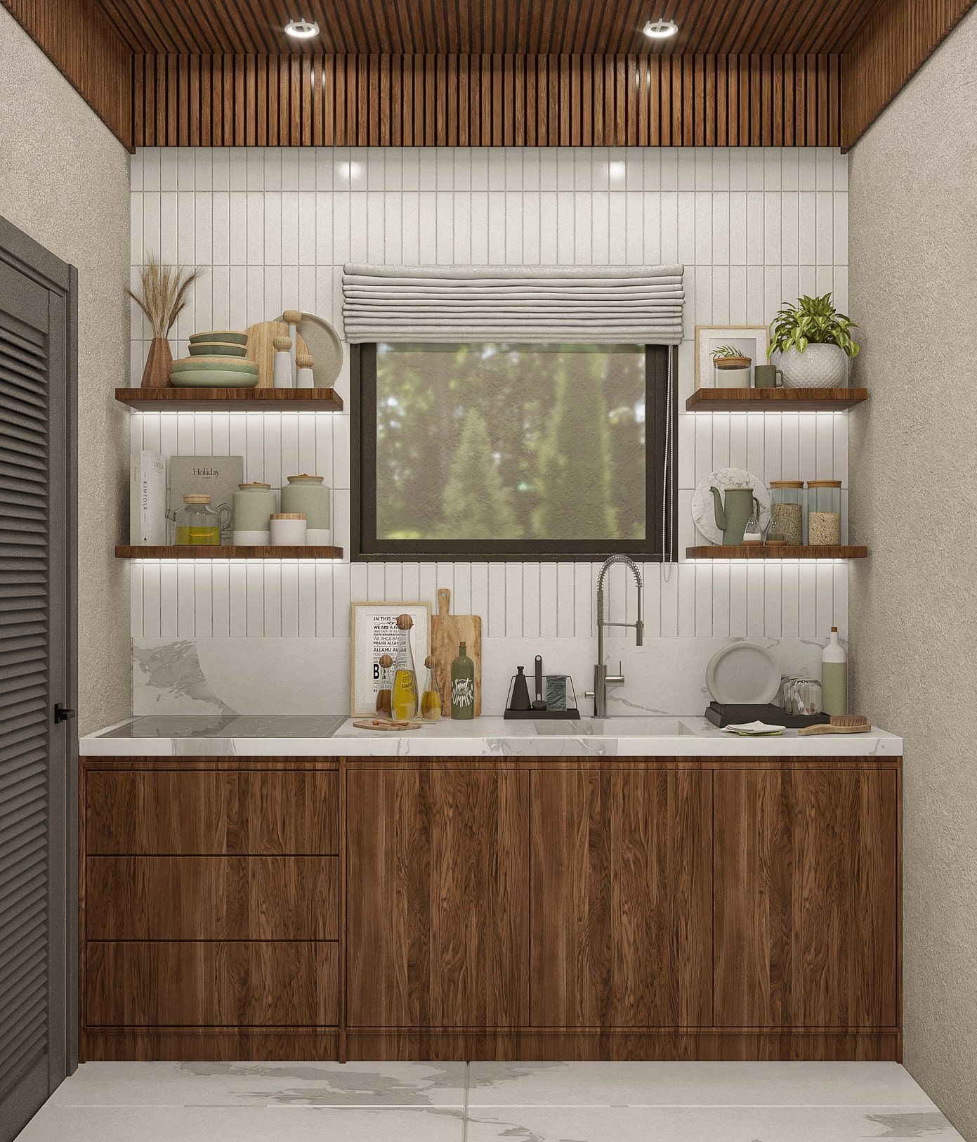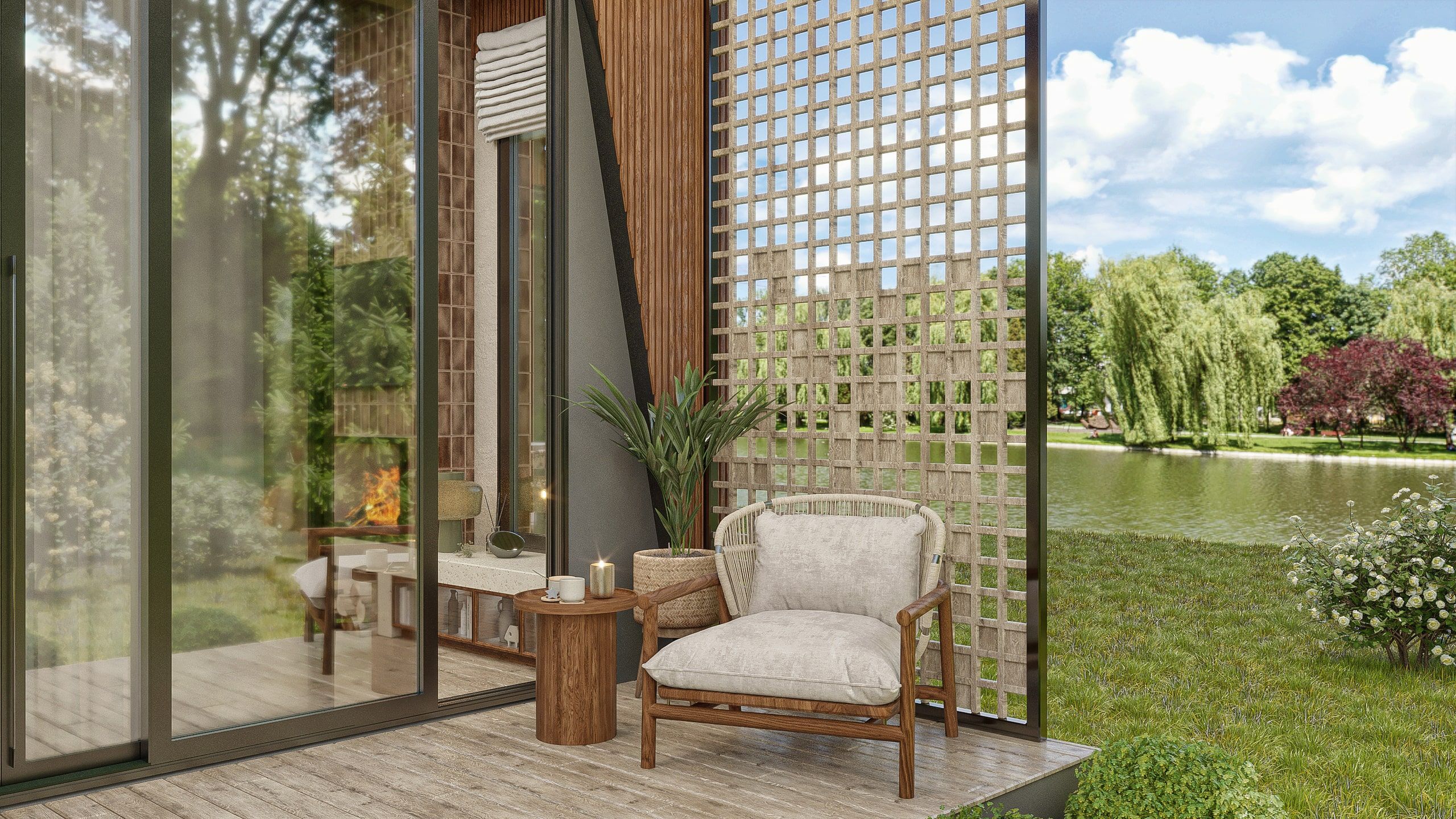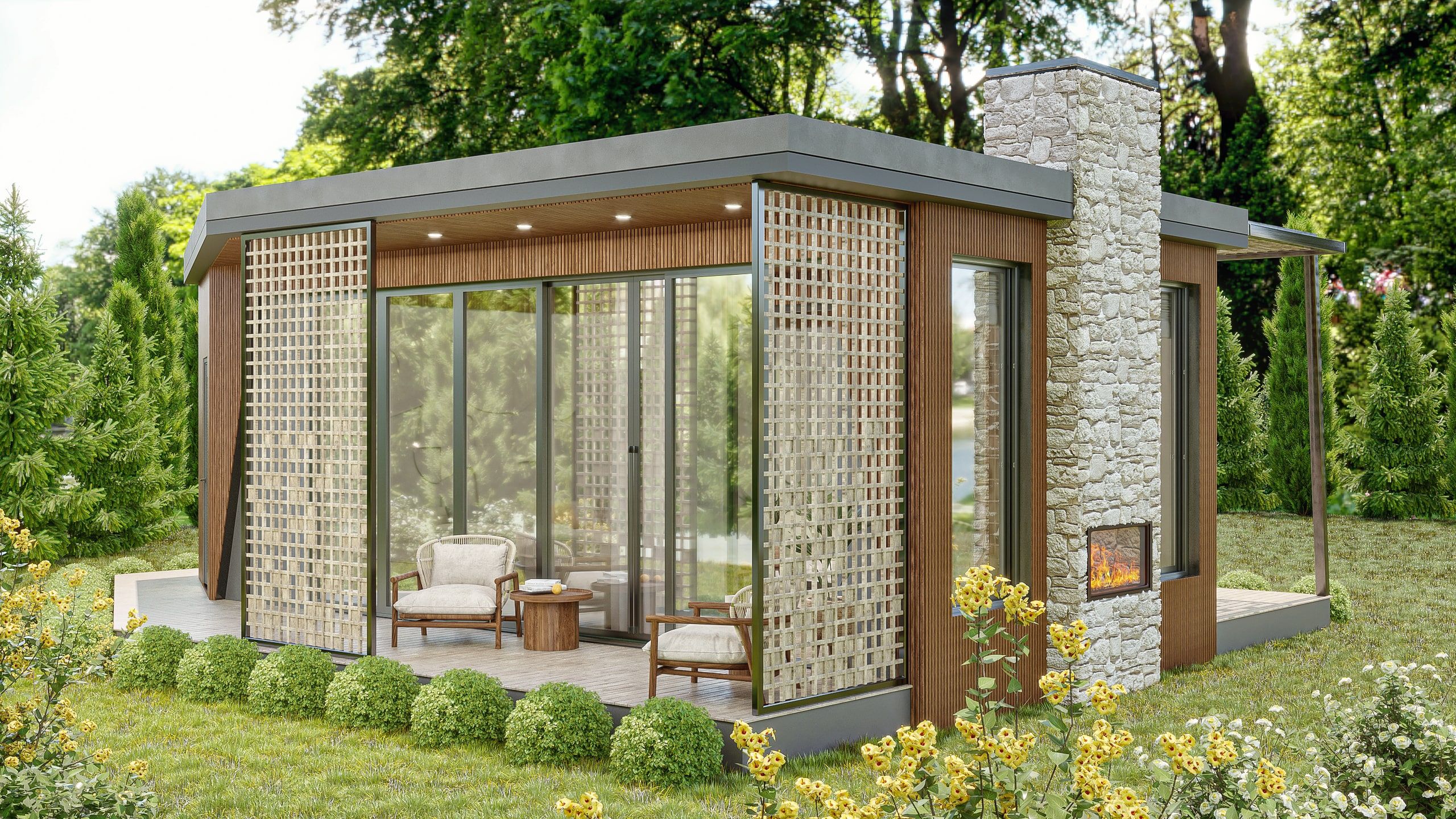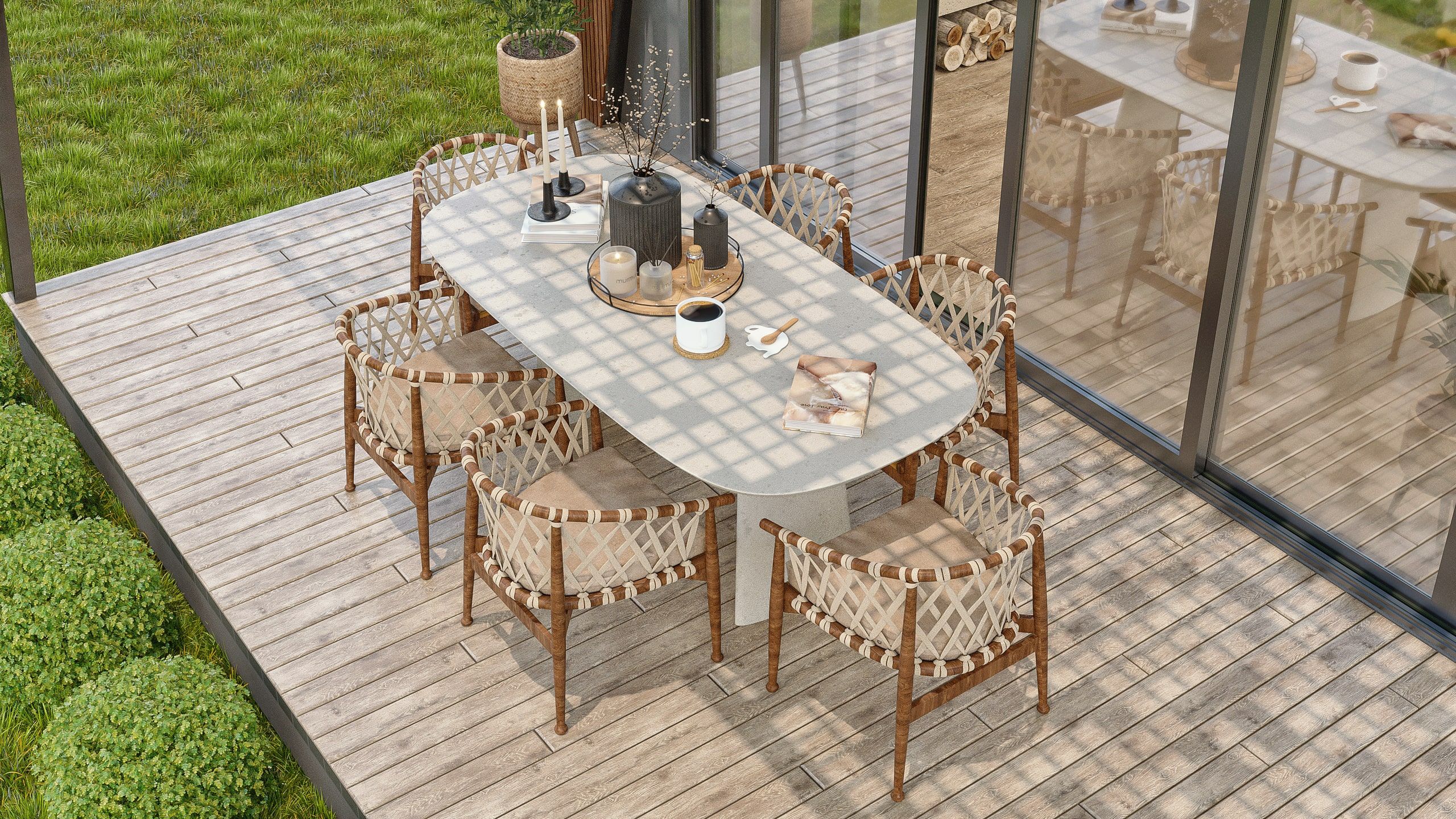 Bahçenin dışarısının yeşil bir alana sahip olması enerji ve renk getirirken, kullanılan ahşap zeminler de atmosfere doğal bir sıcaklık katmıştır. Dış mekânda kullanılan bahçe mobilya takımının da kış bahçesi ile olan uyumu iç içe geçmiş bir atmosfer etkisi yaratmıştır.