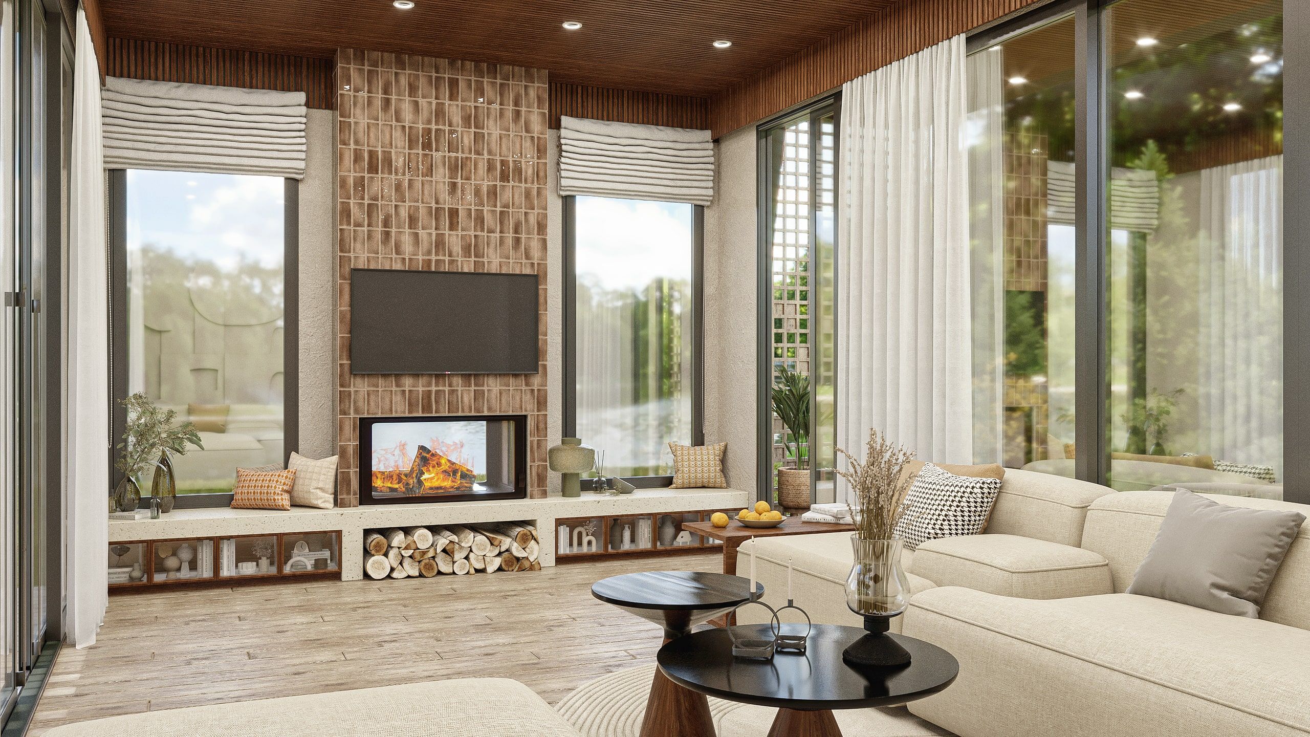 Kış bahçesi projemizde duvar rengi ve döşemesi olarak kullanılan sıcak tonlar mekânı sıcak göstermiştir. Alanın büyük olması ve gün ışığının yeterince ortama yayılması avantajıyla mekândan maksimum verim elde edilmiştir. Kış bahçesinin ortasında konumlanmış olan şömine alana sıcaklık ve doğallık katmakla kalmıyor aynı zamanda da duvarına yerleştirilen TV ünitesi ile de odak noktası haline geliyor.